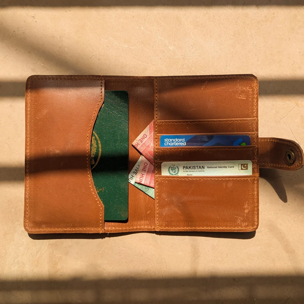 Made with canvas and artificial leather, this rustic holder features pockets for your passport, cards, and cash. Keep all your important documents secure and easily accessible with a closing button flap.