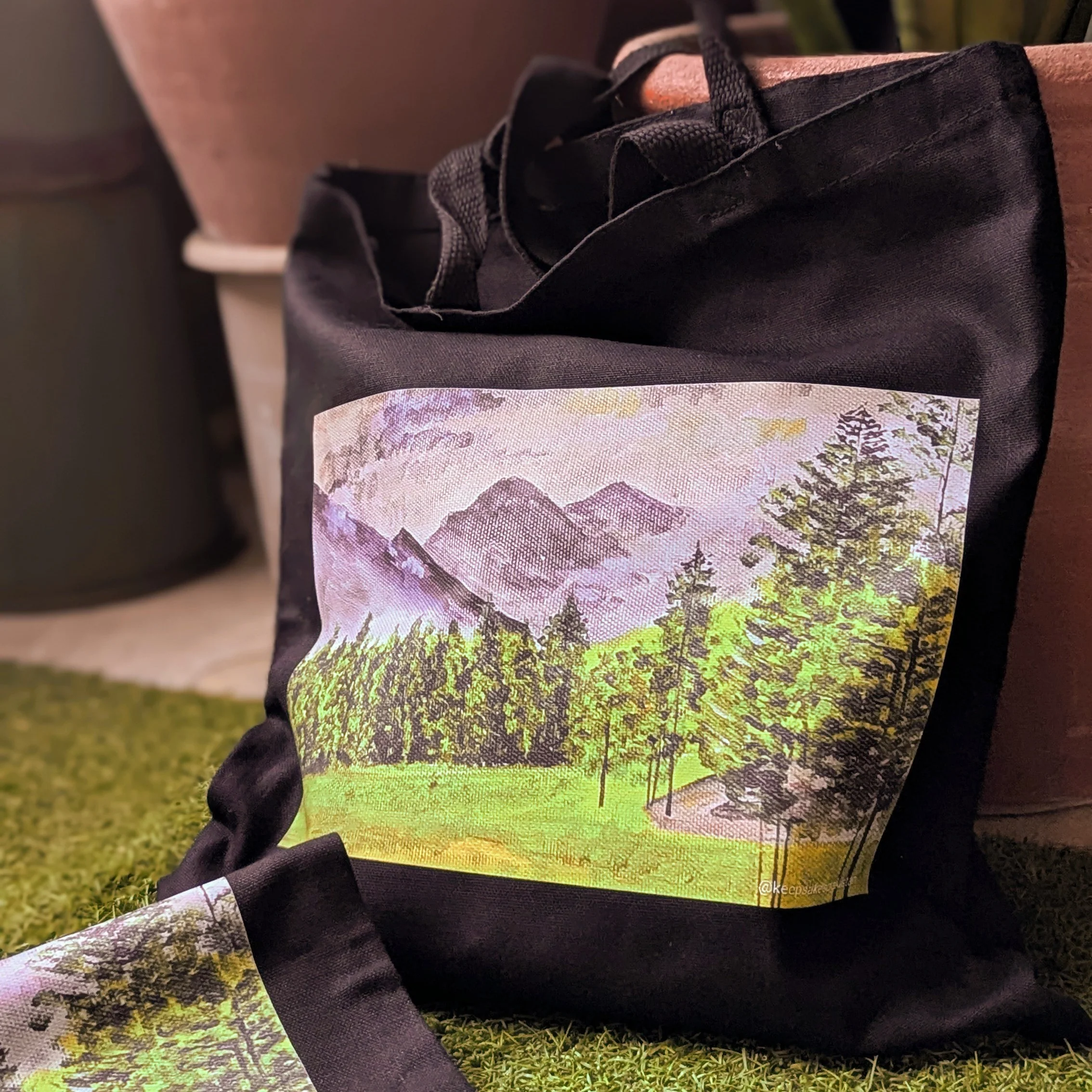 Carry the beauty of Shogran with you đČThis black canvas tote bag features an original painting print of Shogran, KPK.